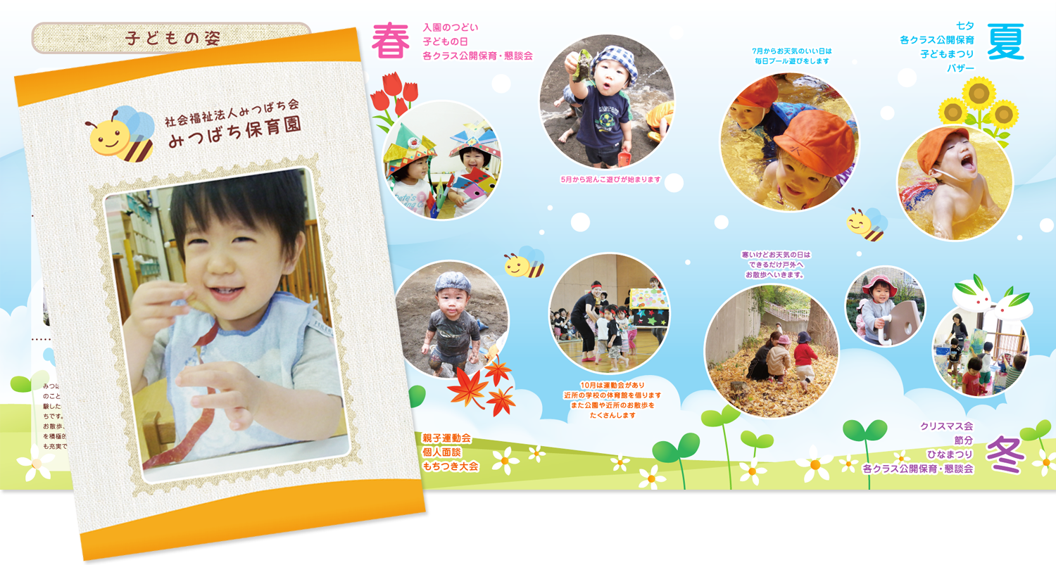 社会福祉法人 みつばち会様が運営するみつばち保育園様の入園パンフレットです。入園案内に来られる保護者様に少しでもわかりやすい資料を制作されたいとの事で、ホームページのテイストに合わせで制作させて頂きました。